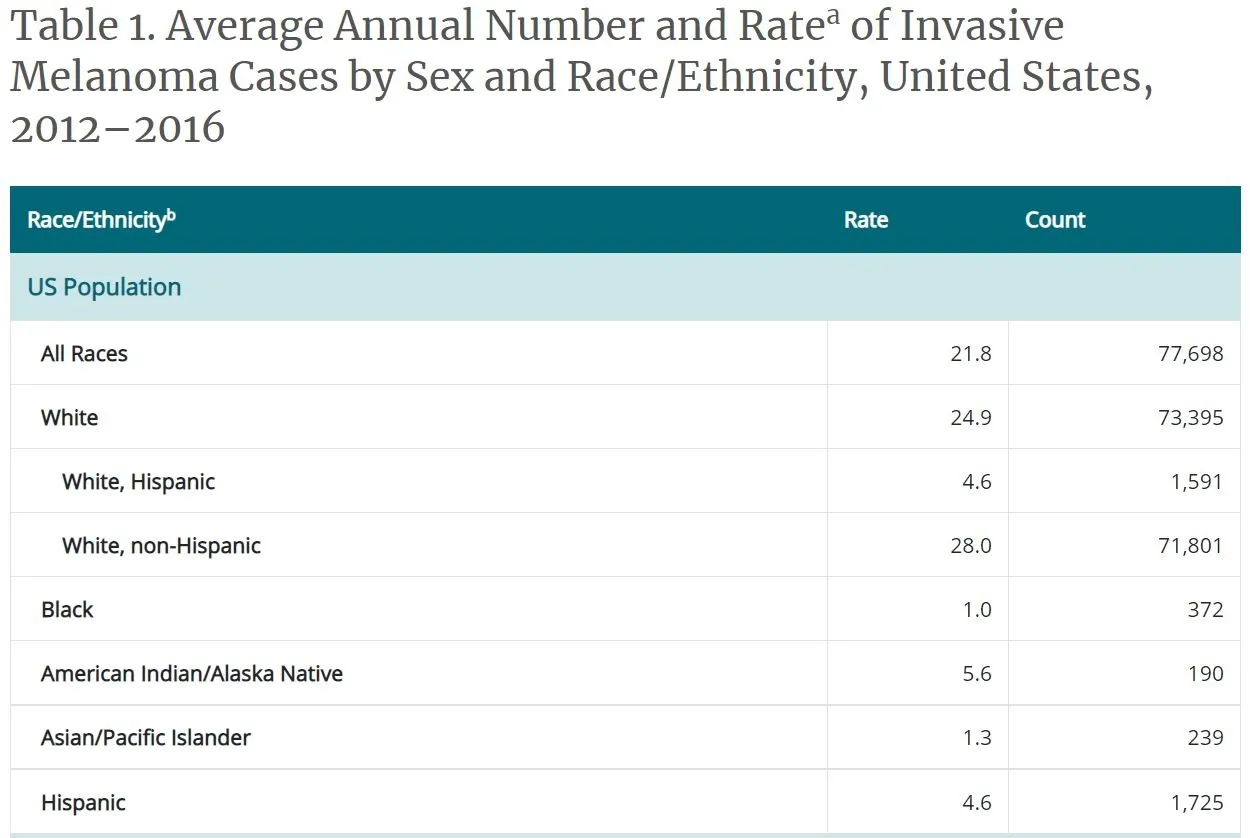BUT!!! 若再將探討地深入,便可以知道太陽輻射對於不同人種皮膚癌的致癌性是不同的!在 WHO 官網上提到,皮膚癌的人種相關風險因子包含有:(1)白人 (2)藍、綠、或淡褐色眼睛 (3)淺色頭髮,而這也在美國疾病管制與預防中心提供的數據得到證實,由下圖可見,亞洲人的發生率遠低於白人:
